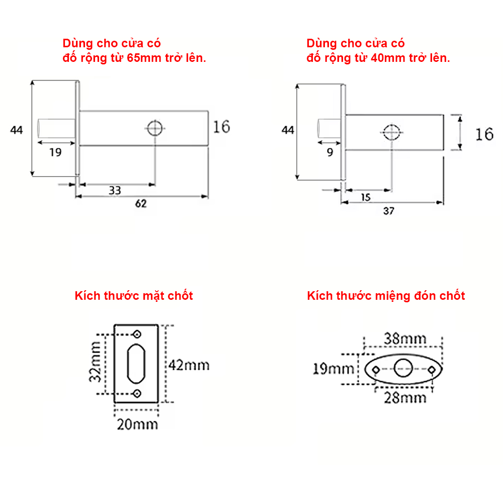 | Chức năng | Chốt gài ngang mặt trong cửa |
