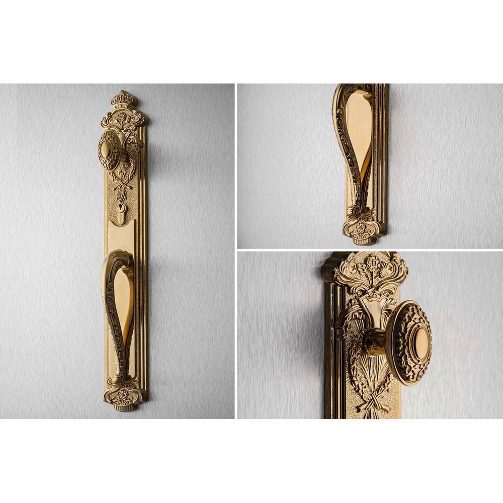 • Tay ốp khóa sản xuất bằng vật liệu đồng vàng (đồng thau) mạ PVD màu vàng gold.