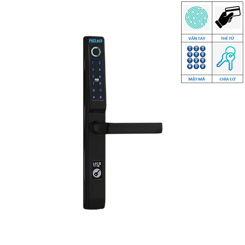 | Chức năng | Mở khóa bằng vân tay, mật mã, thẻ từ và chìa cơ |